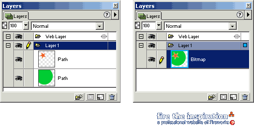 然后观察层面版(Window->Layers),我们可以看出通过2种编辑模式创建的对象的区别。在位图编辑模式里,星型被直接画在下面的位图上,以后无法再修改和编辑,而在矢量编辑模式里星型是一个单独的对象,可以移动、修改。事实上,位图编辑模式的部分和Photoshop还是非常相象的。