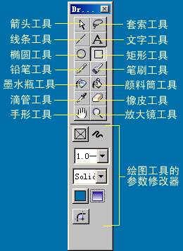 左图所示是Flash全套绘图工具的简要介绍。Flash的绘图工具大致包含以下几大部分:选取工具,绘画工具,文字工具,涂色工具,擦除工具以及查看方式选择工具。对应于不同的工具,在工具栏的下方还会出现其相应的参数修改器,可以对所绘制的图形作外形,颜色以及其他属性的微调。例如左图下方所示为矩形工具的修改器。 表示所绘制的矩形没有外框,下面的选择框分别可以选择线宽和线型,点击 可以对所绘矩形的颜色作调整,而 的作用是控制是否给矩形加上圆角,以及加入圆角的半径。对于不同的工具,其修改器是不一样的。关于这方面的内容,我们将从下一节开始一一详细介绍。