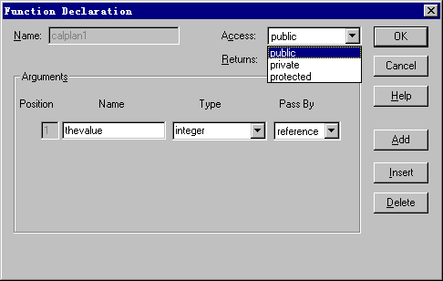 在这里可以定义这个函数的访问类型,PUBLIC 表示可以从应用程序的任何地方访问这个函数,PRIVATE表示这个函数只能在当前对象的脚本当中被访问,而PROTECTED 则表示只有当前对象以及当前对象的子对象可以访问这个函数。我们选择PRIVATE类型。