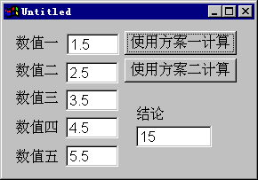 在程序中其它使用这个类用户对象的地方也要进行同样的工作。我们运行这个程序。刚才定义的对象可以使用两种处理方案进行数据处理,按下“按方案一计算按钮”,对象对数据取整加和,如图11-21。
