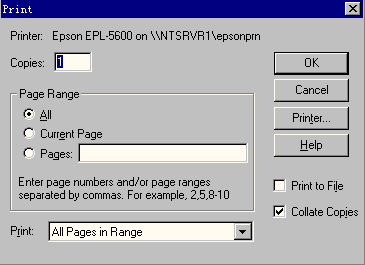 在COPIES编辑框当中,您可以输入需要打印几份拷贝,在PAGE RANGE 组框当中,您可以设置打印的范围,选择ALL可以打印所有的页,CURRENT PAGE的意思是只打印当前页,您还可以在PAGES一项当中自己输入需要打印哪些页。