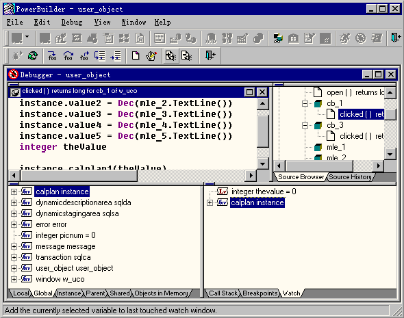 可见WATCH窗口的作用就是将需要观察的变量组织在一起,使调试工作更加方便。如果需要将一个变量移出WATCH窗口,可以先鼠标单击选中这个变量,然后再单击PAINTER BAR上面的REMOVE WATCH按钮,就可以了。