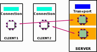 随后,这两个客户机在服务器中创立了两个服务线程,它们相互独立,各有两个不同的内存区域,不同的工作环境。因此,当一个服务线程发生运行错误时,不会影响另外一个服务线程。这两个服务线程其实就是服务器中同一个NVO的两个拷贝(图16-4)。