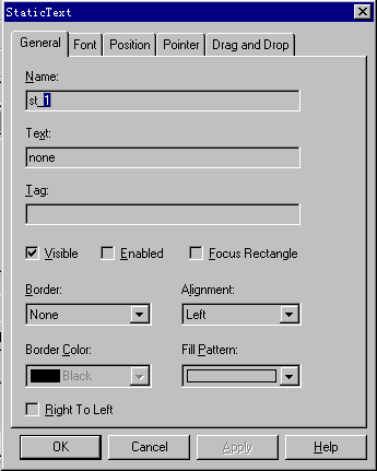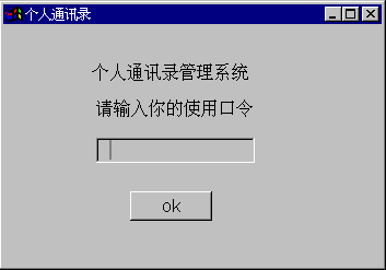 2-23为了使窗口更美观一点,可以对已放入窗口中的控件调整位置和改变一些特性,单击第一个静态文本框选中它,然后放到合适的地方,在上面单击右键,在弹出的菜单中选择PROPERTIES菜单项,系统弹出一个对话框用来设置这个控件的属性(图2-24),NAME栏显示的是控件的名字,这个名字是用在以后编写的脚本中,系统已经设置了一个缺省的名字,这里不作修改,接下来的TEXT一栏是用来设置显示在静态文本框中的文本,这里把它改为“个人通讯录管理系统”,设好后单击OK按钮,用类似的方法把调整另外一个静态编辑框的位置,并把上面的文字改为“请输入你的使用口令:”,然后激活单行编辑框,调整好它的位置后把鼠标放在它的右边框上等鼠标变成水平双箭头形状的时候单击并拖动鼠标,把编辑框拉长一些;最后调整命令按钮的位置并把上面的标题修改为“OK”。用鼠标右键单击窗口中没有控件的空白区域,然后在弹出的菜单中选择PROPERTIES菜单项,在弹出的对话框中把TITLE一栏改为“个人通讯录”,然后单击“OK”按钮关闭对话框。