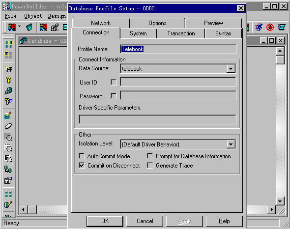从FILE菜单中选中CONNECT菜单项,系统弹出一个子菜单(图4-1),其中的菜单项被分成了两部分,上面部分中的菜单项代表了系统可以连接的数据库描述的名字,数据库描述是用来定义和存放与某个特定的数据库或者数据源相连时所需要的各种参数的,它将在程序进行数据库相连时被使用,为连接工作提供所需要的各种参数。加了选中标记的表示系统当前所连接的数据库来自这个数据库描述。如果我们单击其它的数据库描述,系统将会把这个描述中的数据库设置成当前数据库。CONNECT菜单的下面部分的两个菜单项是非常重要的,它们用于配置数据库的信息。选中PROMPT菜单项,系统弹出名为DBMS的对话框,让用户选择数据库管理系统,列表框中列出的是当前PowerBuilder支持的所有类型的数据库管理系统。这里选择ODBC类型,它最常用,也最具有通用性。选好后单击OK按钮,弹出一个对话框让我们选择数据源(图4-2),也就是数据库的名字,这里显示的数据库都是可以使用ODBC方式访问的数据库,也就是我们刚才选中的ODBC类型的数据库。选择我们以前创建的TELEBOOK数据库,然后单击OK按钮,系统就连接到被选中的数据库并打开SELECT TABLES对话框用来选择数据库中的表,从这里开始就可以对当前的数据库进行你需要的操作。关闭SELECT TABLES对话框,单击FILE菜单,然后选中CONNECT菜单项,可以发现这是它的子菜单中没有一个处于选中状态,也就是说没有一个数据库描述被选中,这是因为此时我们没有利用数据库描述来间接连接数据库,而是采用交互的方法直接选中了一个实际的数据库并打开它。