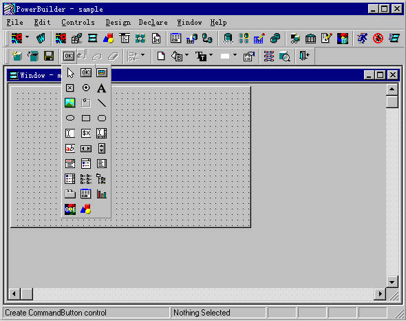单击POWERBAR工具条上的WINDOW按钮,在打开的对话框中选择MYWINDOW窗口,然后单击OK打开它。注意PAINTERBAR工具条上的工具条画板按钮,它是一个下拉按钮,单击按钮上的下拉箭头,屏幕上弹出的就是所有可用控件(图6-7),这里将只介绍常用的控件。