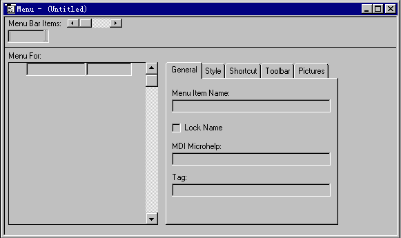 7-1注意MENU画板中的“MENU FOR:”一栏,在这里就可以定义当前选中的菜单对象,这里也就是FILE菜单对象的下一级子菜单项。这里不妨输入一个子菜单项EXIT,就为FILE菜单定义这一个子菜单项,