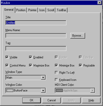 打开窗口的属性对话框(图7-2),单击MENU NAME栏旁边的BROWSE按钮,在弹出的SELECT MENU对话框中选择刚才创建的菜单MYMENU,然后单击OK按钮,就为新建的窗口MYWINDOW添加了菜单。接着把属性对话框中的TITLE一栏修改为“THIS IS A MENU TEST PROGRAM”,输好后把WINDOW TYPE中的窗口类型修改为“MDI FRAME WITH MICROHELP”,然后单击OK按钮关闭对话框。最后单击PAINTERBAR工具条上的SAVE按钮,把新建的窗口起名为MYWINDOW 。 这样就把菜单连接到了新建的窗口上。联好菜单后再在窗口中放入一个STATIC TEXT控件,并且把控件的标题修改为“ITS BACKCOLOR WILL BE CHANGED”,将利用菜单来修改这个控件的背景颜色。接下来就可以编写脚本了。