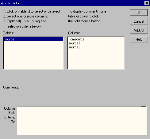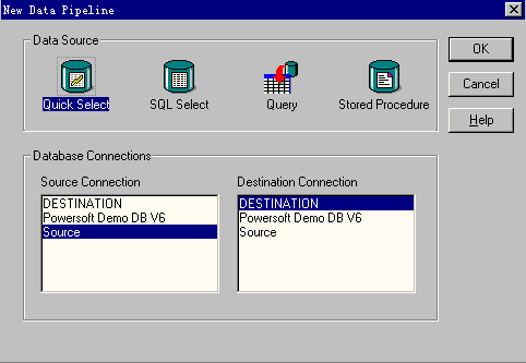 在DATABASE CONNECTION 组框中,我们可以选择源数据库和目的数据库。在左边的列表框中选择源数据库SOURCE ,在右边的列表框中选择目的数据库 DESTINATION,然后单击对话框的 OK 按钮,QUICK SELECT 对话框出现了,这是因为我们在前面的数据源选项中选择的是QUICK SELECT。如图8-4。