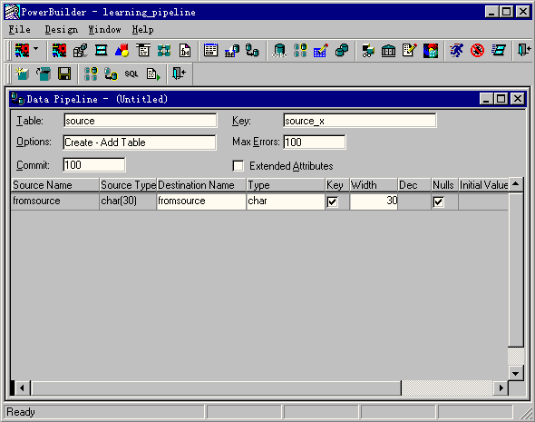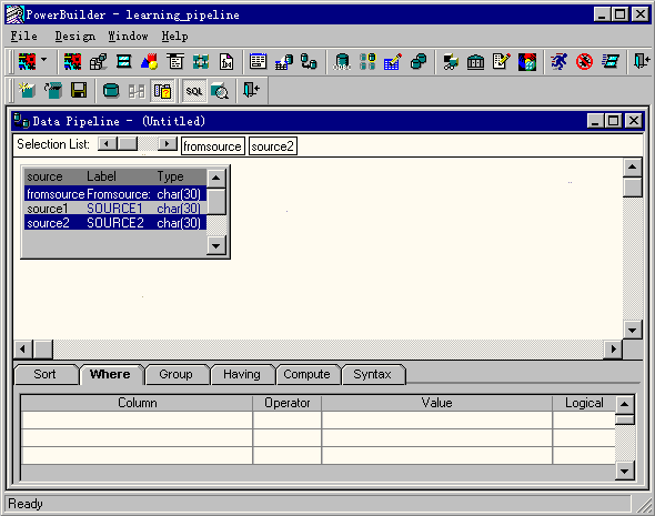 我们选择SOURCE 表中的 FROM SOURCE 列,单击 OK 按钮,这时我们看到的才是 DATA PIPELINE 画板的工作区(图8-5)。