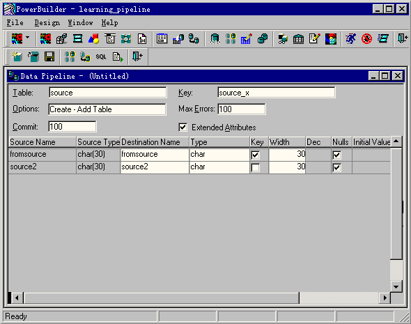 然后返回数据管道工作区,这时 POWER BUILDER 会弹出一个对话框提示数据管道的源数据已经更新,单击确定按钮表示确认。这时,我们可以发现源数据确实更新了。如图8-7。