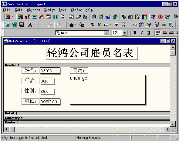 生成报表是用户肯定要提出的要求,利用数据窗口,我们可以制作出丰富的商业报表。下面我们通过一个例子说明如何设计和打印一张雇员名表。