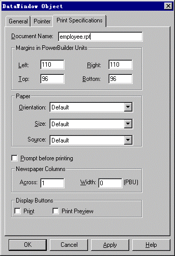然后在数据窗口上面单击鼠标右键,弹出菜单,选择PROPERTIES 命令,屏幕上弹出属性定义对话框。单击PRINT SPECIFICATION这一页,进行打印设置工作。敲入文挡的名字。这个组框是用来设定报表在上下左右方向空出的页边尺寸的。在PAPER这个组框当中可以设置打印纸的型号。我们全部接受缺省的设置。单击OK按钮。如图9-14。