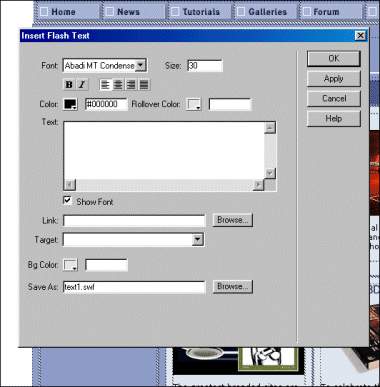 Dreamweaver 4提供的Flash文字和Flash按钮对象让你可以直接在Dreamweaver中建立可以编辑的矢量图形,你甚至都不需要在你的机器上安装Flash