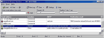 但是AEV提供了多线程功能,最多可以支持100个线程,也就是可以同时校验100个E-mail地址。线程具体设置多少,理论上应该是越大越好,但是如果你在校验的过程中还需要使用的网络功能的话,为了留一些带宽给其他的程序,还是将线程数稍微设置的小一点。至于超时设置,AEV除了会将对方服务器确认不存在的邮件地址认为为无效之外,还会将一定时间内无法连接上服务器所在的邮件地址设置为无效。由于目前中国的网络条件还不是很好,建议将超时设置设置的大一点,以避免因为网络的因素而造成判断失误。AEV提供的设置从10秒钟到5分钟,笔者建议设置在1分钟左右比较好。