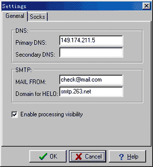AEV的设置分成两部分,一部分是在界面的Settings按钮中。按下这个按钮中,会弹出一个窗口,要求你设置DNS和SMTP服务器。DNS服务器我们可以不设置,因为国内的ISP都提供缺省的DNS服务器,我们不需要借用国外的服务器。至于SMTP服务器,实际上设置成什么都无所谓,因为AEV实际上本身便在充当一台SMTP服务器的角色,这里设置的属性不过是为了拟真成一台实际存在的服务器。当然,如果你愿意,也可以根据你的实际情况填写。除此以外,AEV还提供了Socks的设置,主要是用来设置Porxy的,因为使用Proxy的不多,所以在这里就不介绍了。