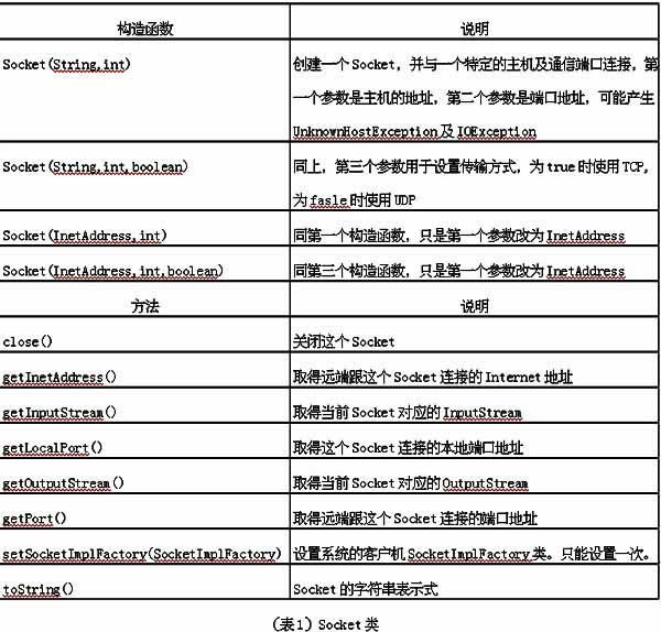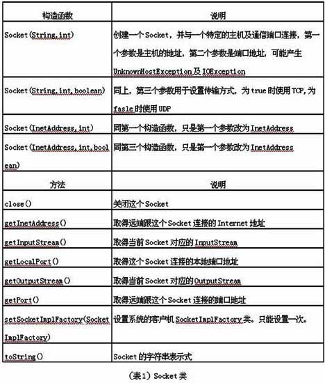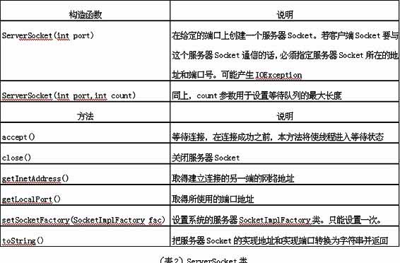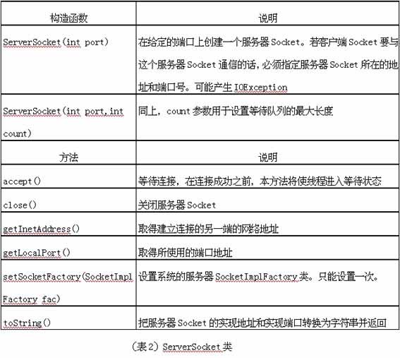 在进一步讨论之前,我们先来看看Socket和ServerSocket类的定义(表1)和(表2),关于这两个类的详细内容请见sun公司的JDK或microsoft公司VJ++ 1.1的联机文档。