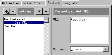 这个教程延续教程九:如何制作按钮(button),来学习如何设定按钮的超链接。 1.打开FLASH;(废话!以后就不说了) 2.选择打开文件图标,打开教程九已经制作好的动态按钮button.fla ; 3.选择场景中的符号,按鼠标右键,在下拉菜单里选择最后的"properties" 4.选择"instance propertise"对话窗的"Actions"项 5.点击加号按钮,选择下拉菜单的最后一行on MouseEvent; 6.会看见加号下面命令框里出现on和Endon二行,在右边的选项中勾选release项,同时看见左边命令框的on后面出现一个括号(Release) 7.再次点击加号按钮,在下拉菜单里选择Get URL,会出现如同下图的窗口,在URL窗里输入需要链接的网址(本例是打开一个名为test.htm的页面,如果是网址,则需要输入全部路径,例如 http://www.netease.com); 8.如果你的链接覆盖在原来页面上,则在window窗里输入参数_top;如果你需要开新窗,则在window窗里输入参数_blank;如果你是用的分帧页面,则window窗里的参数就是你的frame的name(例如:right,left,main),不是页面名称。 9.全部设定好,按确定就可以了。 10.需要说明的是:这个例子作好后,ctrl+enter是看不到效果的,必须作在html页面里才知道是否正确,你也试试吧:)