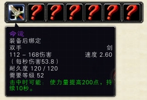 命运是一把极富攻击能力的双手武器,适合攻击型战士和圣骑士使用。极高的基础伤害和中等的攻击速度,能造成持续和稳定的高伤害。而命运的特殊属性:击中时可能在10秒内增加使用者200点力量,可以使以力量为主属性的攻击型战士和圣骑士的战斗能力在短时间内得到可观的提高。