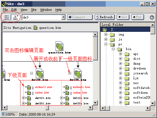 站点结构图以树状结构方式显示了网站中文件的链接关系,结构层次。有些项目子文件过多,显示很庞大,可以点一下主要文件前的减号,子文件就不显示了,同时减号变成了加号,这时再单击加号,子文件恢复显示,是不是和资源管理器差不多。