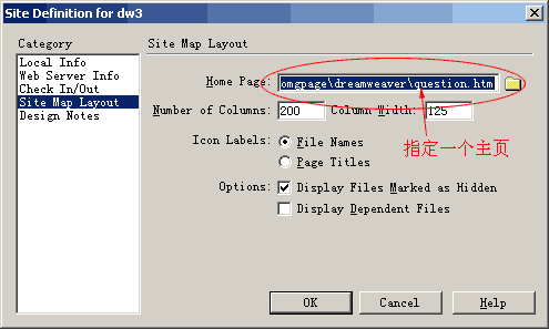 在打开站点结构图时,必须为其指定一个主页,如果没指定,系统会默认为根文件夹下的index.htm为主页。指定主页的方法为:选择“View”菜单下的“Layout”,打开站点定义对话框,在Home