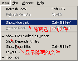 如果想只显示网站中的骨干文件,不显示次要文件,以便突出网站的主要结构时,这个功能就很有用了。比如在当前站点结构图中,想把三级文件隐藏,可以借助CTEL键将其一一选中,然后选择“View”菜单下的“Show/Hide