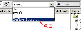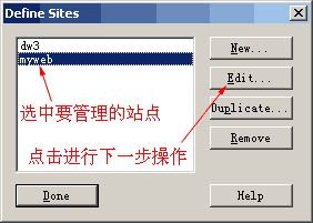 下面我们一起来完成网页的发布。按F5进入站点管理窗口,在工具栏上的站点选择下拉列表框中选择“Define Site”命令(图1),在站点列表中选择我们做的“myweb”网站,然后点“Edit”按钮(图2)。在左侧列表中选择“Web