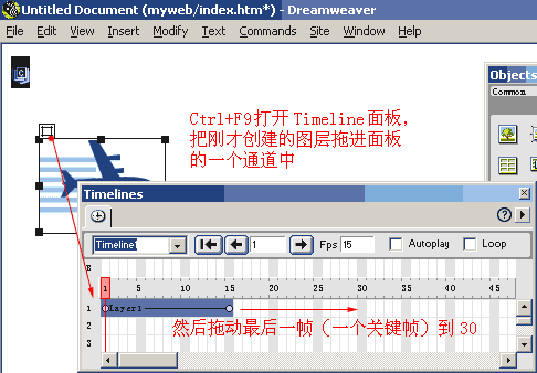 前面我们已经讲过,timeline是通过改变层的位置、大小、可见性以及叠放顺序来创建动画,也就是说timeline只能移动层。所以,如果要移动图像或文本,就要先创建个层,然后将图像、文本或其他类型的内容插入到层中,然后通过移动层来移动这些元素。