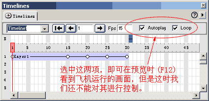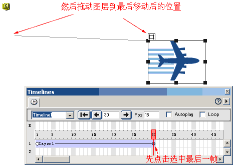 选择“Window->Timelines”命令,打开Timelines面板。选中这个层,把它拖动到Timelines面板的第一帧位置(图2)。一个动画栏出现在timeline的第一个通道内,相应的层名(Layer1)显示在该动画栏中。单击动画栏最后关键帧标记,也就是第15帧,此时注意播放头也跟着移动到该处。向后拖动鼠标到第30帧,这样做出来的动画就有30帧了。把页面上layer1层移到屏幕右侧,此时从动画起始位置到结束位置有一线条显示,这就是层的运动轨迹(图3)。