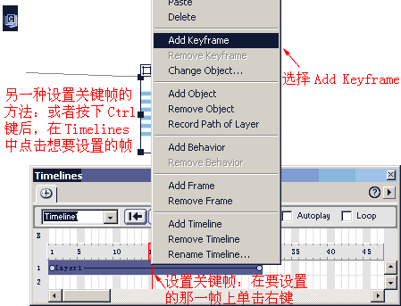 选中Timelines1,点鼠标右键,选“Remove Timeline”,刚创建的时间轴被删除了。选中层,将光标定位在Timelines面板第一帧处,选择“Modify->Timeline->Record