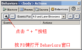 可以说Behaviors是一种事件(events)和动作(actions)的化合物,动作是用JavaScripts事先编好的功能,比如打开浏览器窗口、播放声音或停止播放Shockwave电影等,事件是引发动作的方式,比如移动鼠标,单击鼠标等。