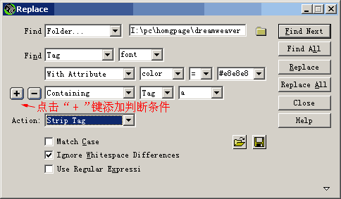 接下来我们设置要进行的动作,在“Action”列表框中选择“Strip Tag”(去除标签)。再检查一遍,确保判断条件无误,点一下“Replace