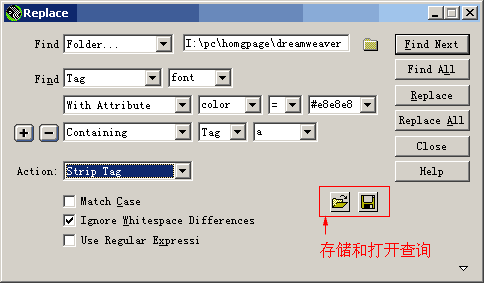 (4)保存查找条件 我们可以将一个比较复杂或经常使用的搜索条件保存起来,便于今后使用。 在查找或替换对话框中,单击磁盘样的“Save Query”(存储查询)按钮,弹出保存对话框,给当前搜索模式起个名字,再点“保存”即可。 如果要使用保存好的查询方式,可以单击文件夹样的“Open Query”(打开查询)按钮,选择所需的搜索方式,就可以进行查询了。
