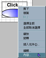 您好,御风工作室精心收集网上的一些教案并结合本站的建站经验,制作了这个网上教材, 意在抛砖引玉,以求共同进步!(以下部分【傑克資訊站 - FLASH】版權所有) 互動式按鈕 ( 2 ) 1. 延續「 互動式按鈕 ( 1 )」, 此單元將為按鈕加上「超連結」以及「目的視窗」的動作 ! 2. 應用「互動式按鈕 ( 1 )」做好的按鈕 , 在場景按鈕處 , 按滑鼠右鍵 , 選擇「內容」選項.