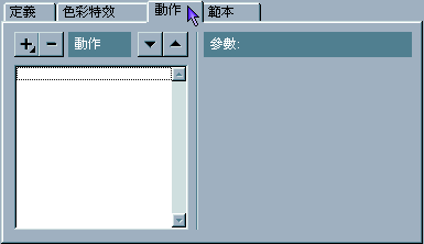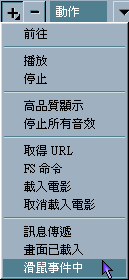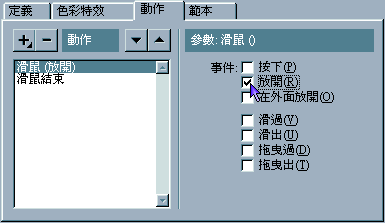 5. 在動作的項目中 , 就增加了「滑鼠 ()」以及「滑鼠結束」兩項 , 請點選右邊滑鼠事件的參數 , 可以依自己的喜好來設定 ,「按下」的意思是「當按鈕按下時 , 馬上執行動作」,「放開」的意思是「當按鈕按下時 , 不執行動作 , 直到按鈕被放開後 , 才去執行動作」, 至於下面幾個事件參數 , 將在往後跟大家介紹.