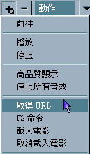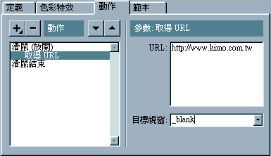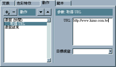 6. 設定完滑鼠事件後 , 接下來就是「超連結」以及「目的視窗」的設定了 ! 在動作「滑鼠 (放開)」的下面增加一個「超連結」的動作 , 方法很簡單 , 按「+」按鈕 , 請選擇「取得 URL」.