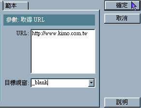 7. 在動作的項目中 , 是不是在「滑鼠 (放開)」的下面新增加一個「取得 URL」的動作呢 ?! 至於參數設定 , URL 當然就是輸入「網址」囉 ! 可以應用 HTML 語法 , 如「http://」、「ftp://」、「*.htm」等等的超連結語法 , 很多人都問傑克要如何超連結 E-Mail , 只要輸入「mailto:電子郵件位址」超連結語法即可 ! 語法與 HTML 一樣 !!