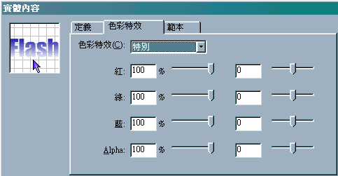 5. 因為「特別」選項綜合「亮度」、「濃淡」、「Alpha」三個特效功能 , 所以傑克選擇此選項來做示範 , 先說明一下左半邊欄位 ,「紅」、「藍」、「綠」這三個很容易懂 , 就是調整符號顏色的濃淡 ,「Alpha」就是調整符號的透明度 , 剩下的右半邊欄位就是「亮度」, 用來調整符號顏色的亮度. 一開始 , 我們都還沒使用任何「色彩特效」, 您可以在右上方符號預覽處 , 看到符號還沒有變化.