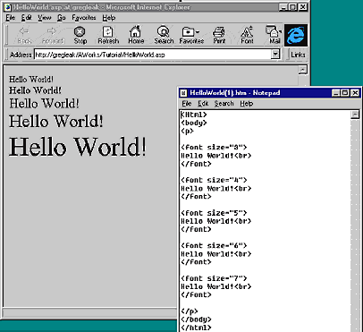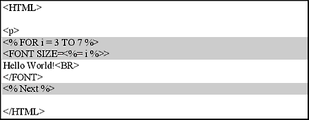| 图5. 交互式主页 (ASP) 是一个包含了服务端scripting的HTML页。服务端scripts由开头和结尾用 <%>标记指定的部分组成,并在主页被送往浏览器之前得到处理。 在这种情况下,一个简单的循环就完成了在HTML页上显示逐渐变大的“Hello World”,显示结果如下。 | Script由包含在ActiveX script 标记或HTML <SCRIPT>标记中的可在服务器 |