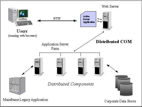 | 图7. Visual InterDev 允许公司从带有分布COM (DCOM)的ActiveX Server组件中获益。 DCOM提供了完全的网络透明度,因此开发者使用相同的scripting逻辑建立 DCOM组件,就象组件在本地的网络服务器上运行一样。 DCOM组件能提供更大的scalability 及容错性对于危险任务的网络应用。 |