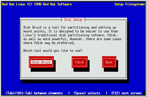 选择您喜欢的硬盘分区工具, 并按[Enter]. 如果您选择了Disk Druid, 请继续阅读. 如果您喜欢fdisk, 请跳到第4.3.2节.