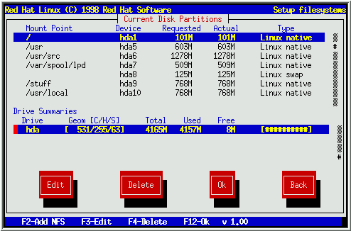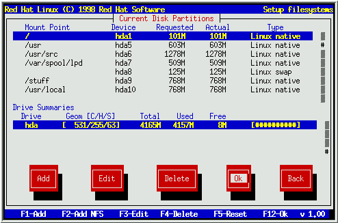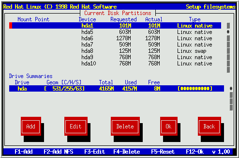 除了某些特殊情况, Disk Druid能够满足典型的Red Hat Linux安装的分区要求.