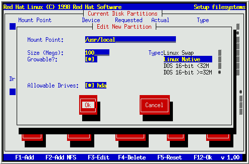 要修改一个分区, 选择'Current Disk Partitions'区域中的一个分区, 选择 Edit 按钮, 并按[Space]. 您将看到一个和图 17十分类似的对话框. 修改适当的值, 选择Ok, 并按[Space].
