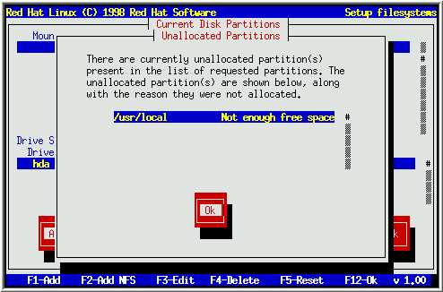当您准备增加一个分区而Disk Druid不能接受您的申请时, 您会看到图18 类似的对话框. 框中列出目前还没有分配的任何分区, 以及它们为分配的原因. 选择 Ok按钮, 并按 [Space] 继续. 注意未分配分区也在Disk Druid主屏 幕中列示(您可以通过滚动'Current Disk Partitions'区域看到它们).