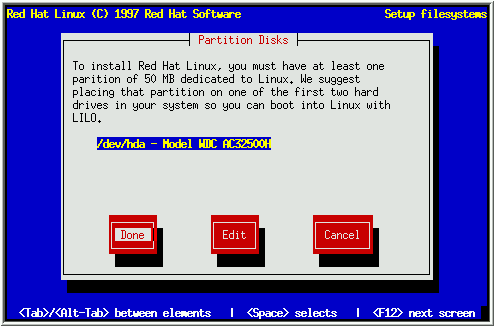 如果您想用fdisk来管理分区, 请看这一节. 一旦您选择了fdisk, 您将看到题为'Partition Disks'的对话框(见图20). 这里列出了您计算机的所有硬盘. 移到您想要分区的硬盘, 选择Edit, 按 [Space]. 您将进入fdisk并可以对您选择的硬盘进行分区. 重复这一过程您将可对每个 硬盘进行分区. 完成后选择'Done'.