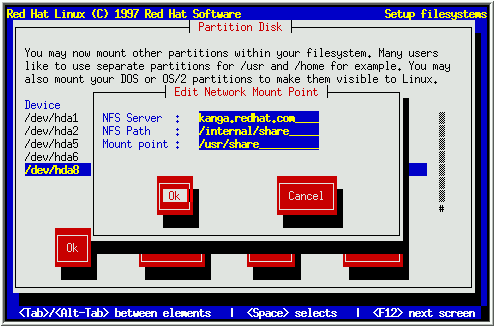 要增加一个只读的NFS文件系统, 按 [F2]. 如果您没有选择与网络相关的 安装方式, 将会出现几个与网络相关的对话框(参见第3.4.3 节). 适当地填写. 然后会出现题为'Edit Network Mount Point'的对话框(类似图23). 在这个对话框您将输入NFS服务器名, 输出文件系统的路径, 这个文件系统的载入点. 根据需要选择Ok或Cancel , 然后按[Space].