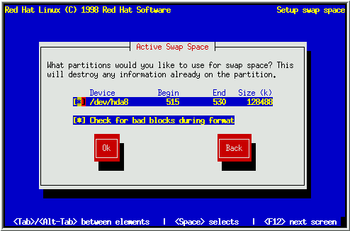 在您为Red Hat Linux创建好分区后, 安装程序开始寻找交还分区(见图24). 如果找到, 他问您是否初试化. 用[Space]键选择您想要初始化的交换空间; 如果您想检查分区的坏块, 选择Check for bad blocks during format框. 然后选择OK, 并按[Space].