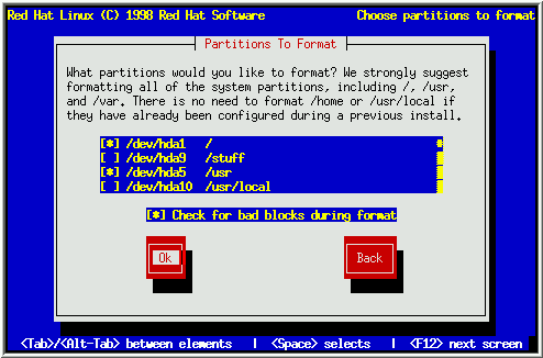 下一个对话框列出要格式化的分区(见图28). 所有新建的分区都要格式化. 另外, 已存在的分区如果包含您不再需要的旧数据, 也应该格式化. 但是, 象/home 或 /usr/local 分区如果包含 您要保留的数据, 就不要格式化. 选择要格式化的分区然后按[Space]. 如果您想在格式化时检查坏块, 选择Check for bad blocks during format. 选择OK,并按 [Space].
