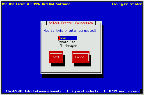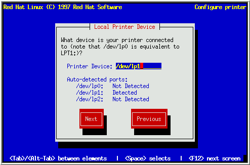 输入打印机连接的设备名. 为了方便, 安装程序试图检测您的计算机可用的打印端口. 选择 Next, 并按 [Space]. 现在跳到第 5.6.4节继续.