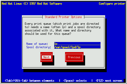 选择打印机类型后, 出现了题为'Standard Printer Options'的对话框(见图36). 输入您想用的队列名和spool目录, 或接受默认信息.